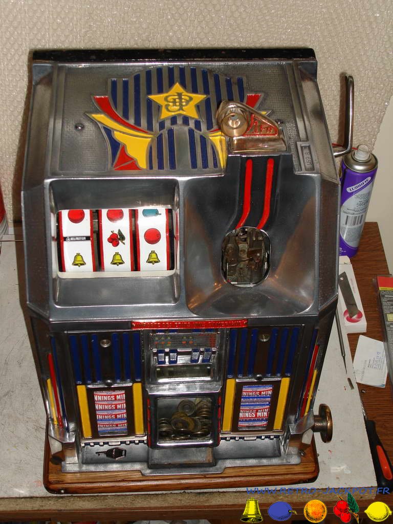 Maintenant que la mécanique re-fonctionne à merveille, on va s'attaquer à la menuiserie et a la façade. Le bois est poncé puis vernis (3 couches). Les parties en fonte d'aluminium sont polies (c'est très long et fastidieux...). Une fois que tout est remis en place, on s'attaque à la peinture de la façade (de 3 à 5 couches selon les couleurs). J'ai changé les panneaux de la façade pour remettre la machine comme à l'origine. Maintenant elle fonctionne avec des jetons pleins pour avoir un rouleau de bonbon et rend des jetons troués.
