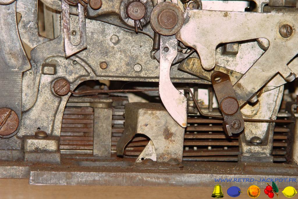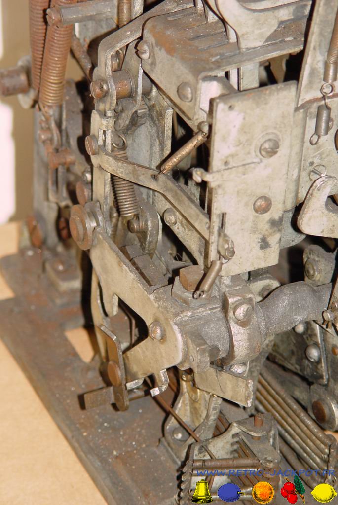 La mécanique est très particulière, on ne la trouve que sur ce modèle et en version modifiée sur la Jennings Little Duke (1932). Cette mécanique a un énorme défaut : le régulateur ou horloge est souvent défectueux car les engrenages sont sous-dimensionnés. Le problème est que ce régulateur est un modèle unique - incompatible avec d'autres mécaniques de la même marque. Donc si vous avez cette machine et que votre régulateur (pignons) est défectueux, vous n'avez plus qu'à pleurer car il est introuvable en pièce détachée. (j'en ai fait les frais !!) Beaucoup de travaille pour la remettre en état !... Mais le cas n'est pas désespéré !! J'ai eu et vu pire !!